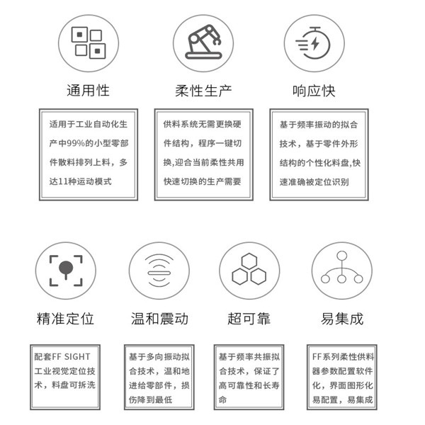 7、易集成,易配置:FF系列柔性供料器参数配置软件化,界面图形化,易配置,易集成,可轻松集成工业自动化设备中各类主流PLC和机器人视觉系统生产中。